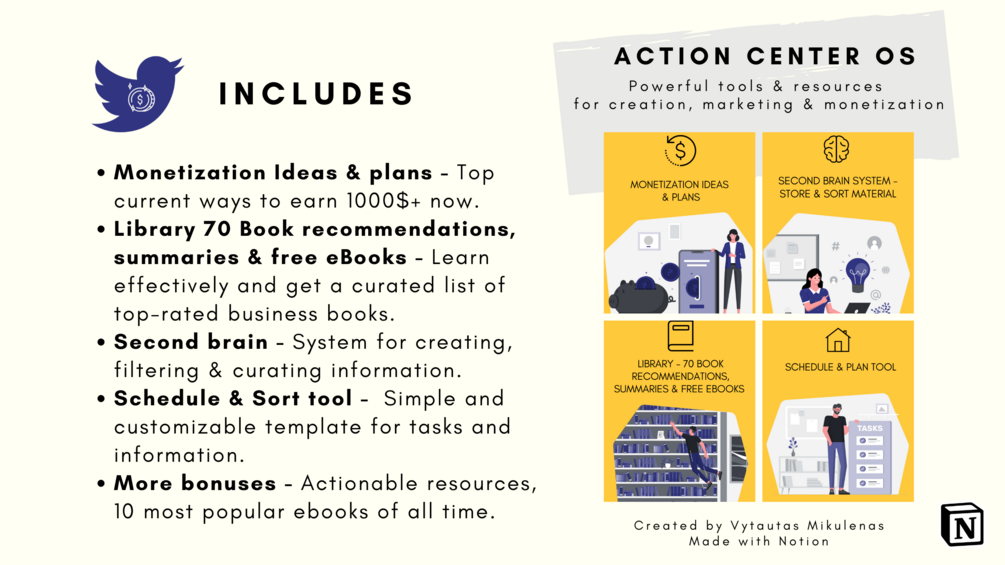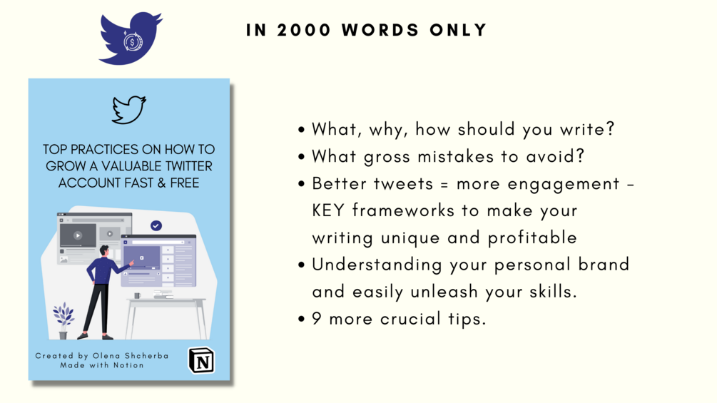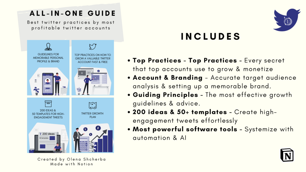 - It contains all current best practices and freshly developed schemes on how to grow on Twitter & make money - Never waste money on another guide/course again.